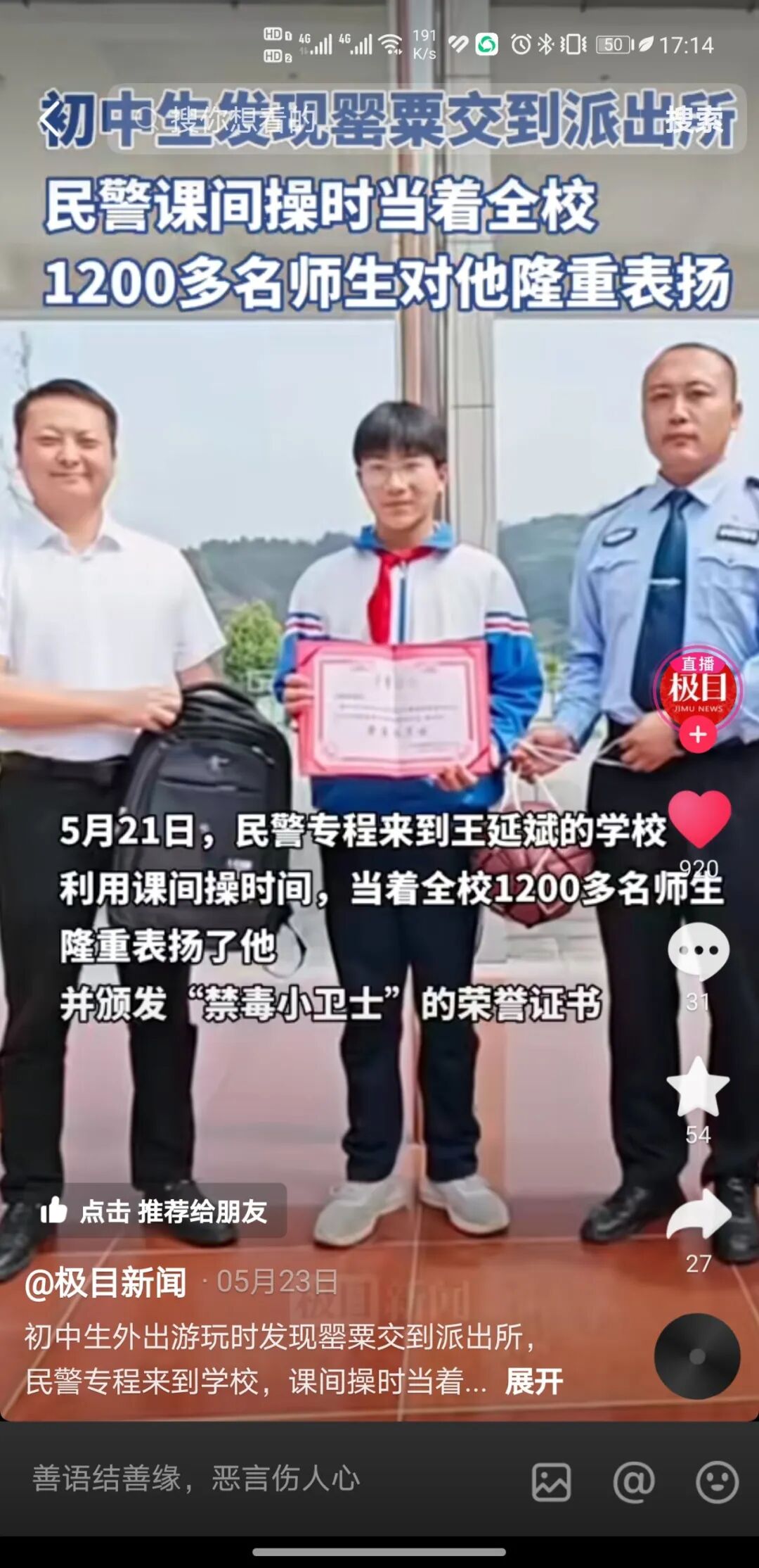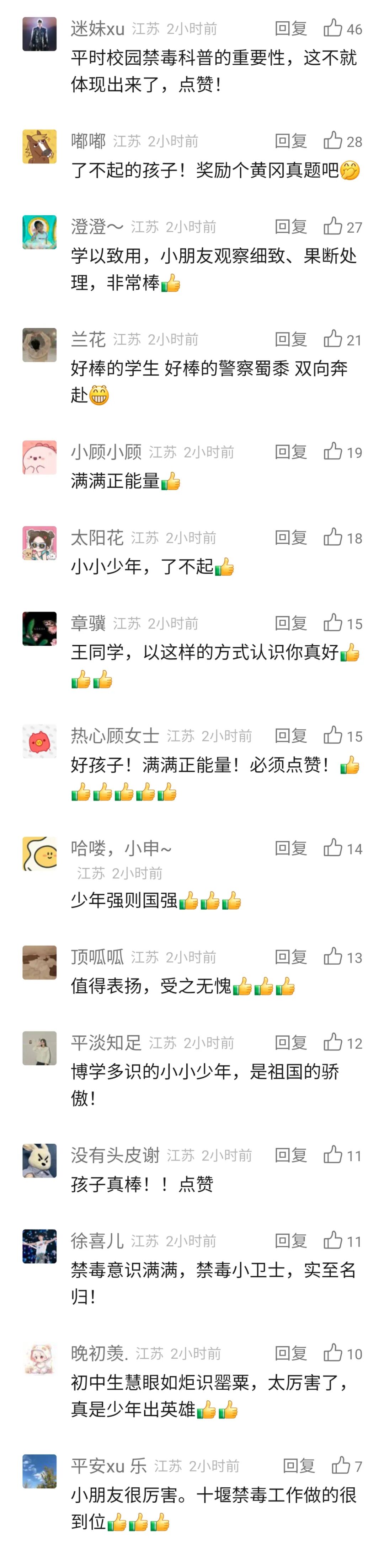 各大媒体重点报道后,全国各地网友纷纷留言,为王延斌同学点赞,同时为竹溪禁毒宣传教育点赞。
