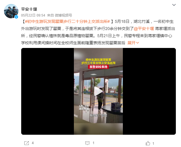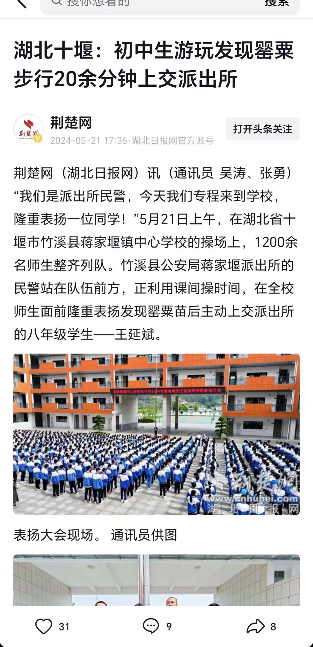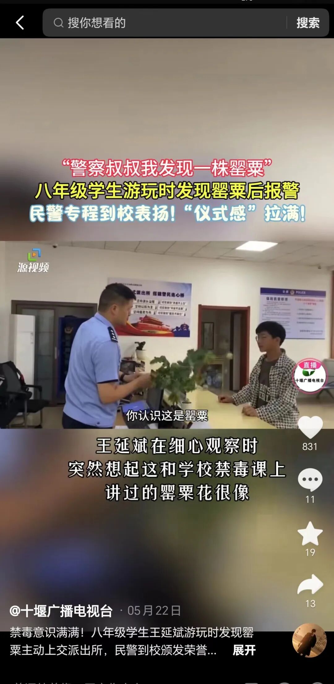 少年强,则国强,去年3月竹溪的两个小姑娘也通过普法宣传识别发现罂粟果并上交警察手中也同样被国家级媒体聚焦关注,获得全网点赞!