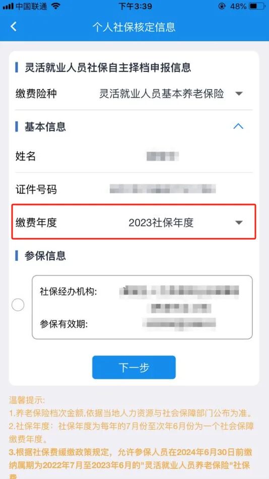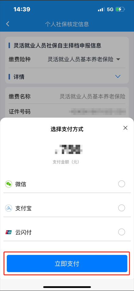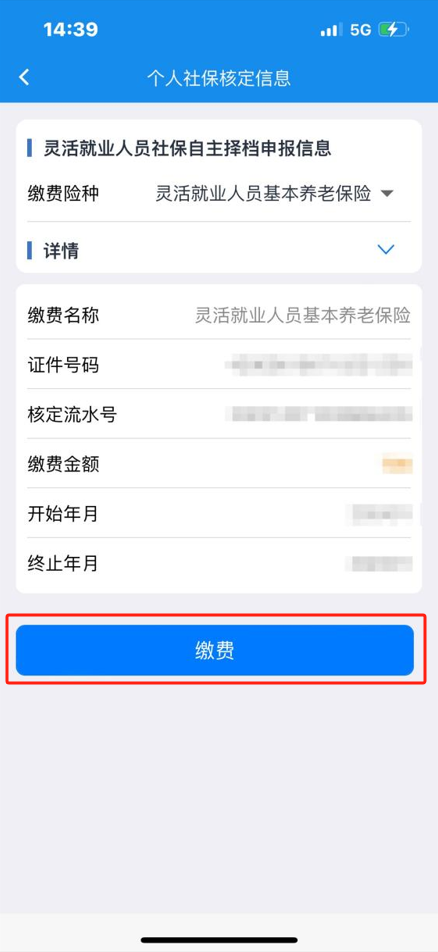 选择险种【灵活就业人员基本养老保险】--->选择缴费年度【2022社保年度】--->选择登记所在地、核定提取方式、缴费档次、缴费属期等信息--->点击【核定信息】--->确认缴费金额、起止年月无误点击【缴费】--->核实参保机构无误点击【继续缴费】,可使用第三方(微信、支付宝、云闪付)进行缴款。