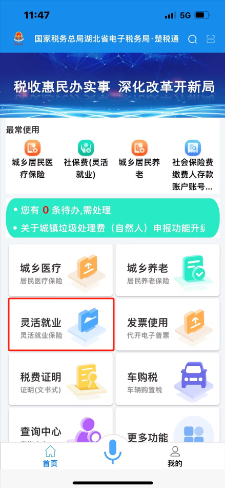 打开“楚税通”APP,点击【首页】--->【灵活就业】--->【灵活就业人员社保自缴】。