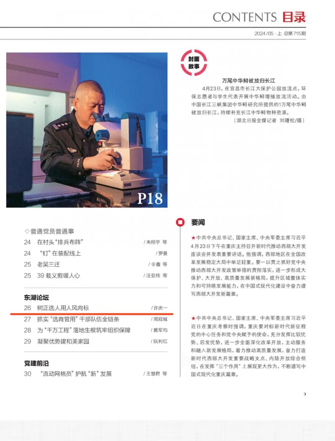 近日,《党员生活》杂志2024年5月上期刊发县委书记许庆一署名文章《树正选人用人风向标》。介绍我县坚持以正确鲜明用人导向引领干事创业导向,激励广大干部在推进中国式现代化竹溪实践中奋发进取、建功立业。