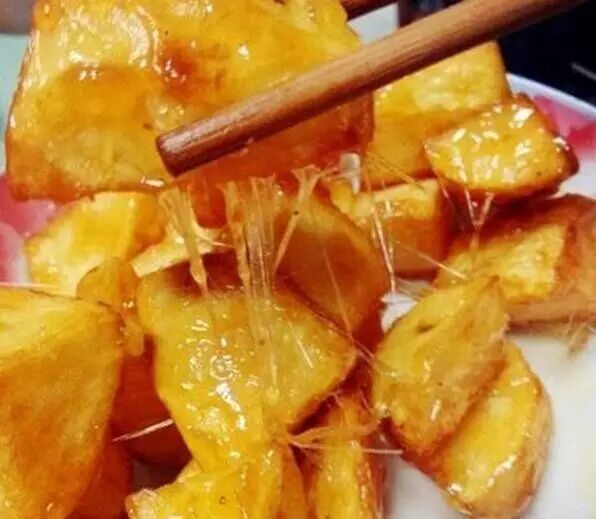 土豆去皮,切成大块,入油锅炸至外面成金黄色的硬皮,出锅待用;锅内放少许油,加热,放入白糖,不停搅拌;待糖熬成糖稀后,倒入炸好的土豆,不停翻炒,直到土豆全部都沾到糖稀,立即出锅。此品外脆内软,香甜可口,但需趁热吃,否则会变硬。