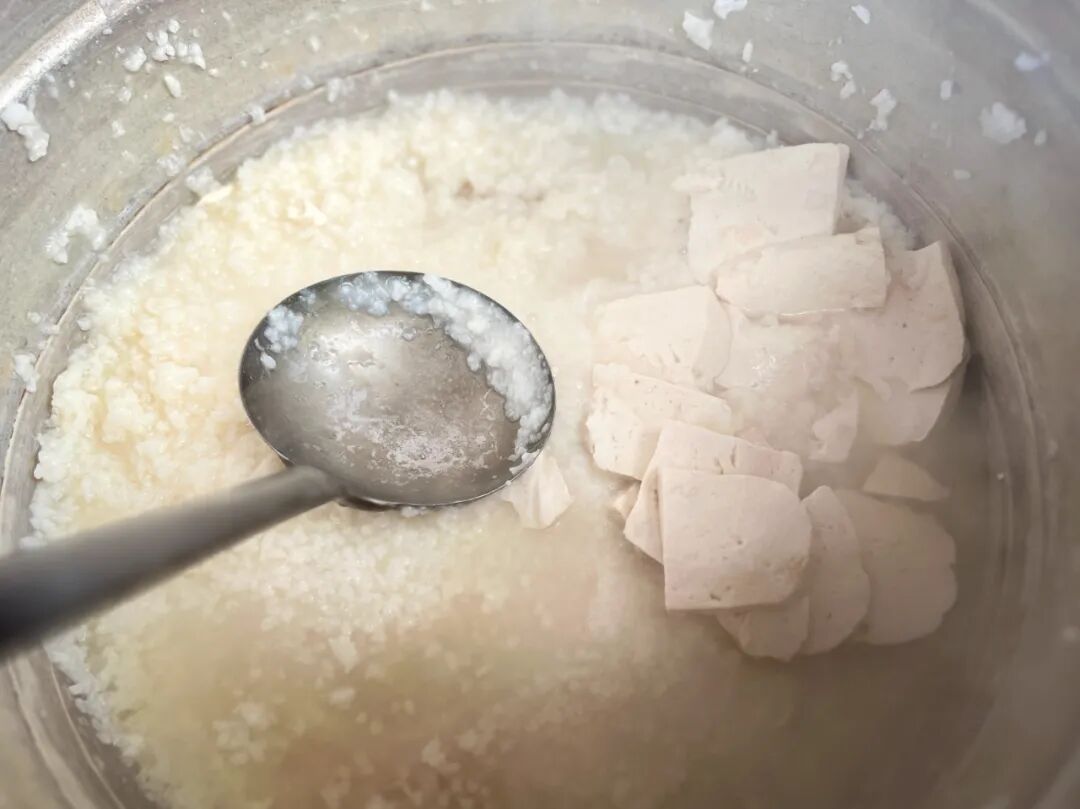 甜浆子是竹溪人打豆腐时候的副产品。新鲜的大米和豆浆在柴火灶上小火慢煮,长时间地闷煮使两者风味充分融合,养身养胃的功效也倍增。