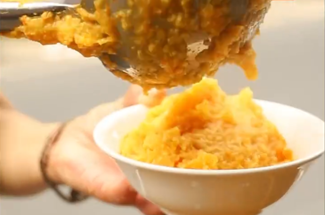 苞谷糊豆儿是先把新鲜的南瓜煮熟,然后再加上苞谷面,两者放一起用小火焖煮,这样就做成了。