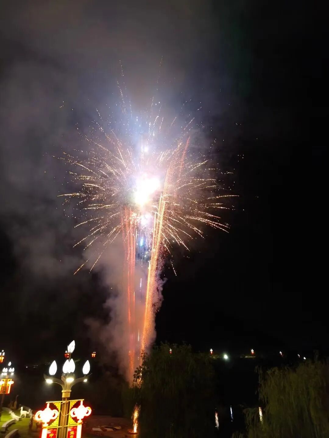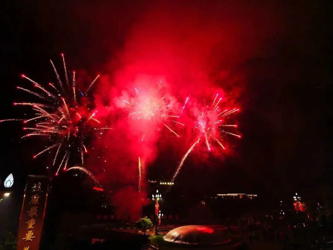 在夯土小镇景区,大型烟花秀以夜幕为背景,以湖面为舞台,以绚烂烟花为画笔,在水上、低空、高空绘画出一幅立体烟花美丽画卷。