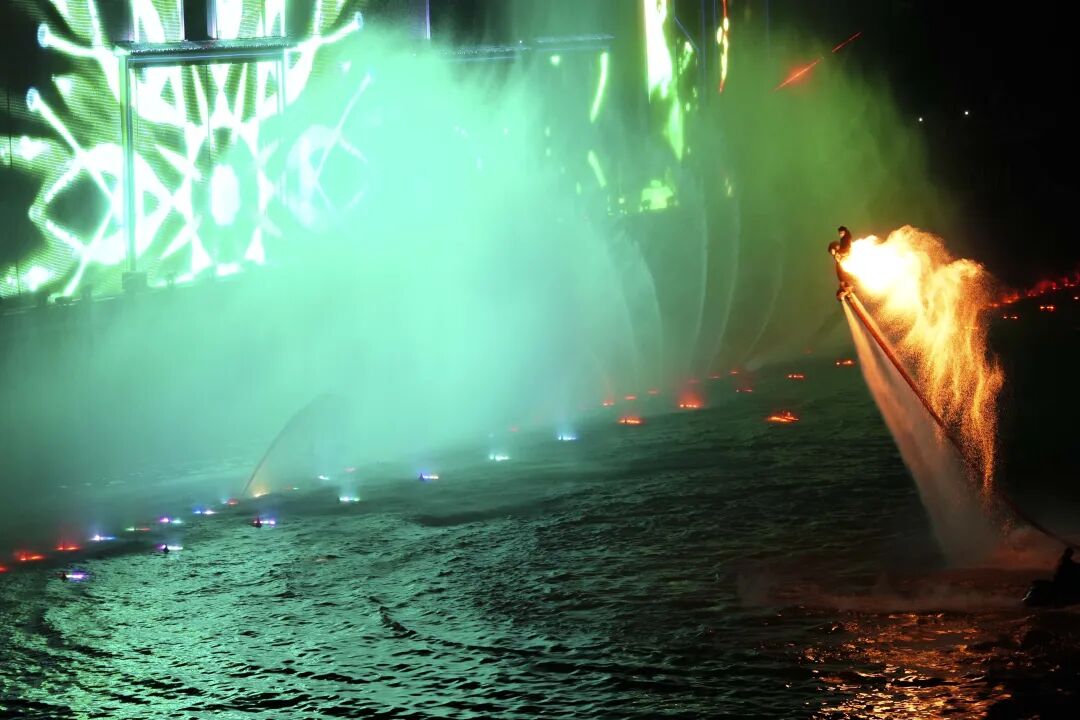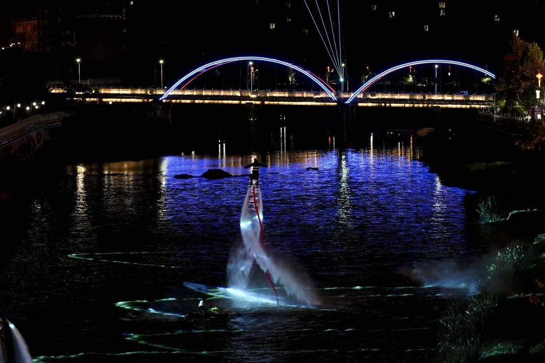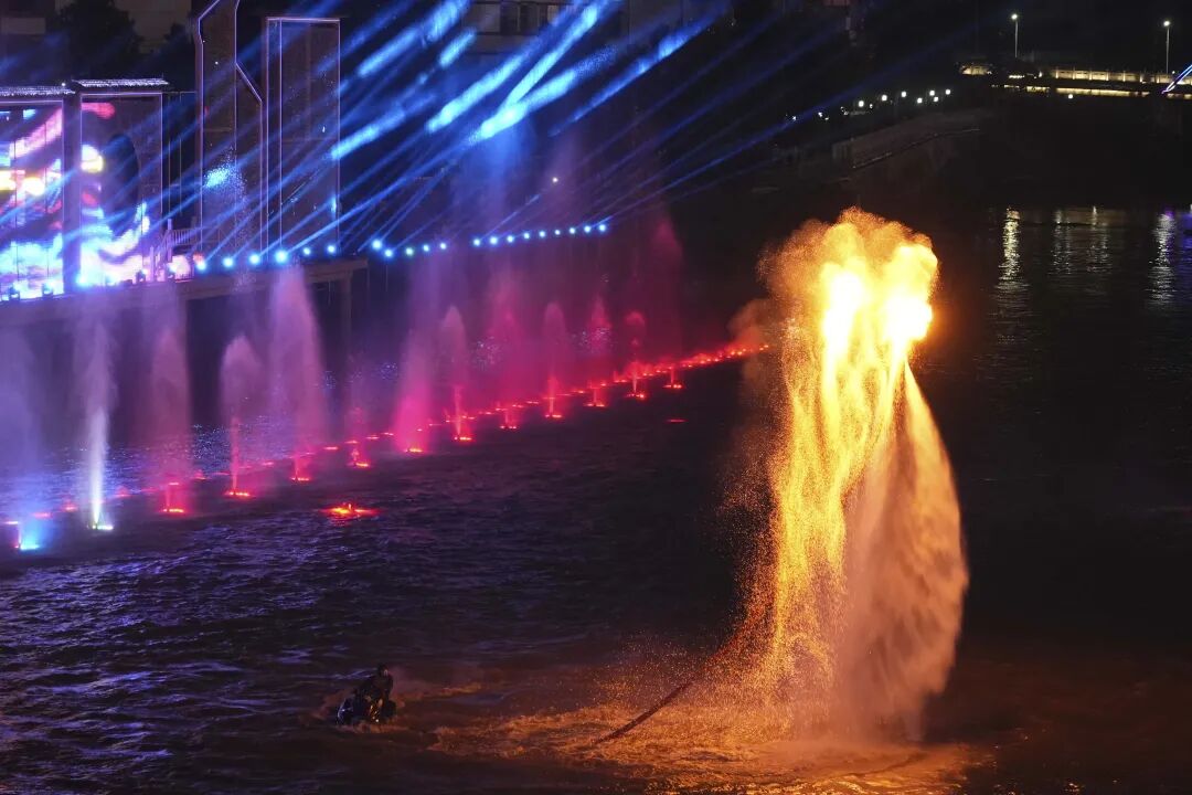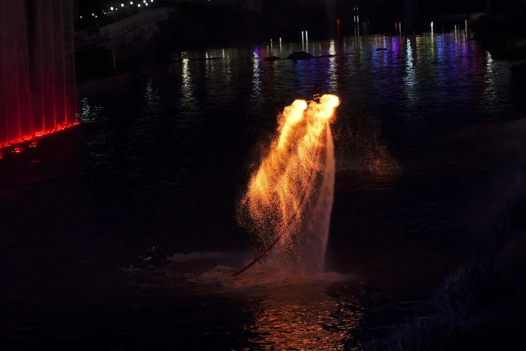 当水上飞人遇上非遗火壶,两种截然不同的艺术形式完美地融合在一起,创造出了令人目瞪口呆的视觉奇观。火壶中的火焰与水上飞人的水花相互映衬,如同一只火凤凰在水中涅槃重生。
