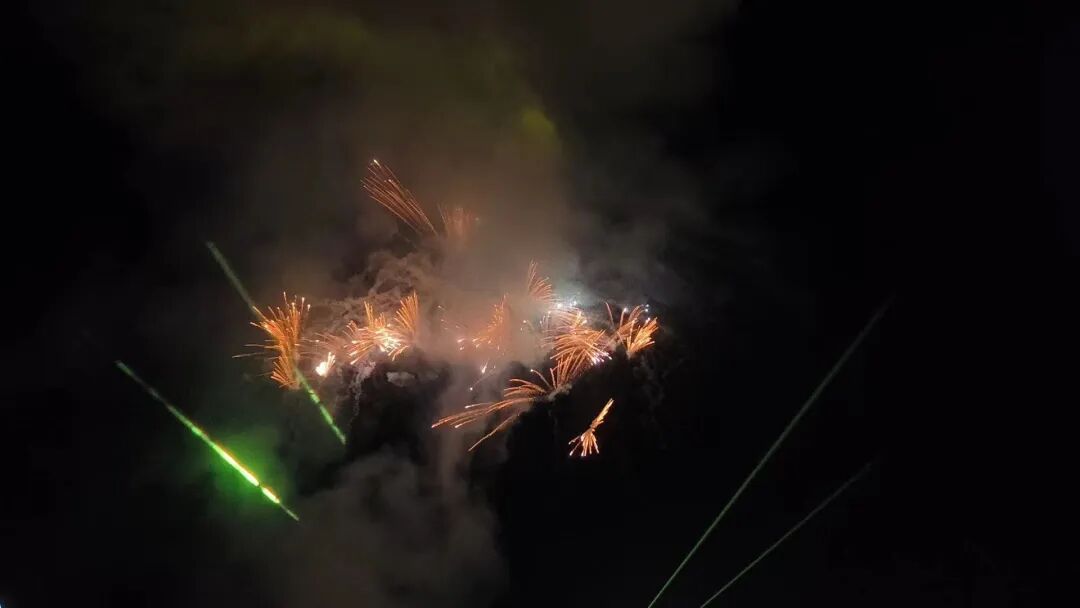 有的散成花形,还有的恍若流星散落。漫天烟花瞬间点亮景区的夜空,一场山水与烟花的邂逅正浪漫上演。