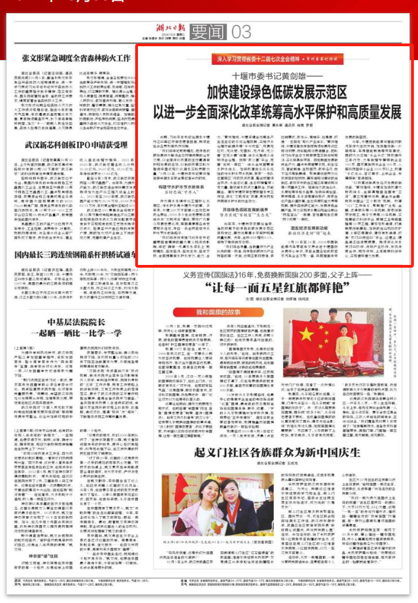 昨日,湖北日报要闻版推出十堰市委书记黄剑雄专访《加快建设绿色低碳发展示范区 以进一步全面深化改革统筹高水平保护和高质量发展》。