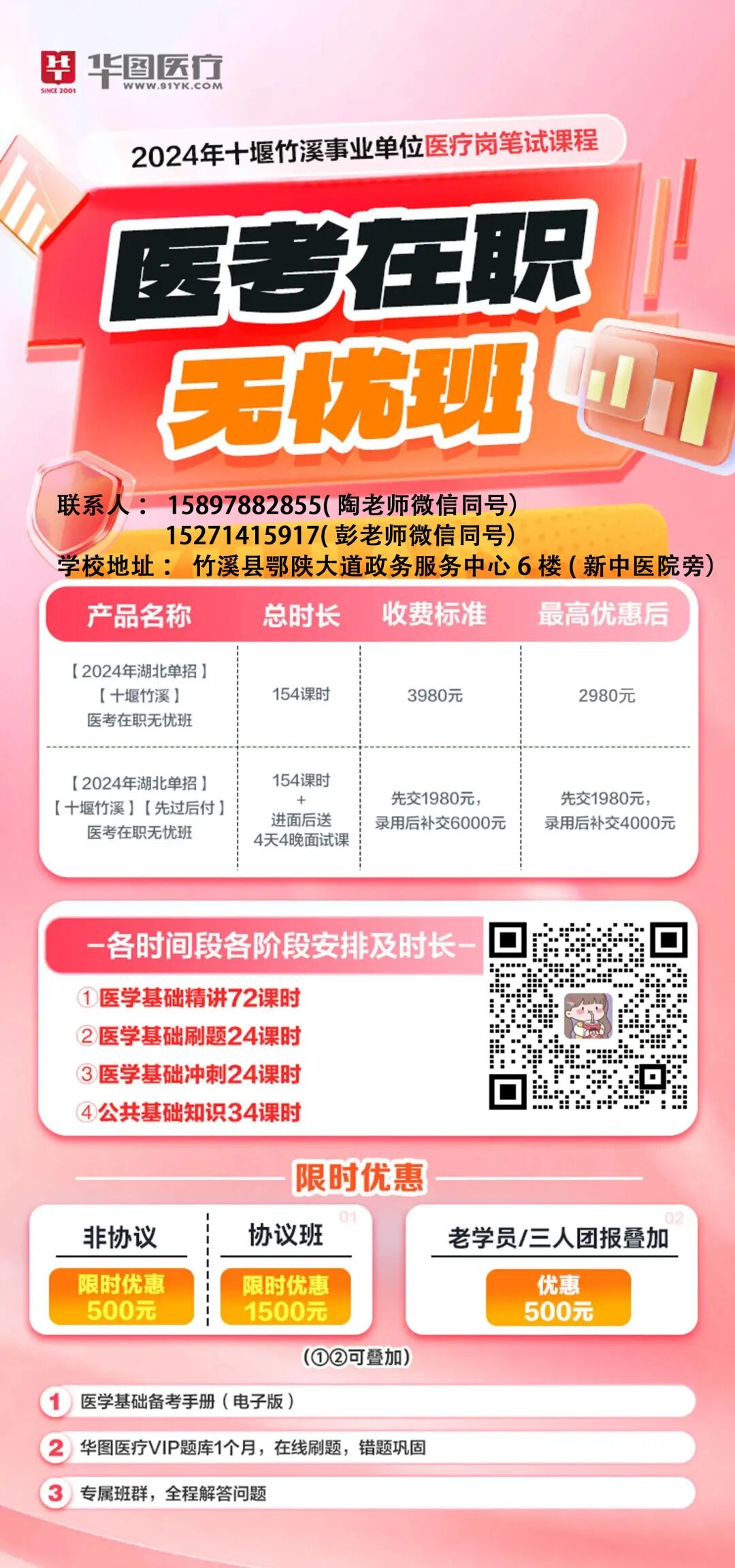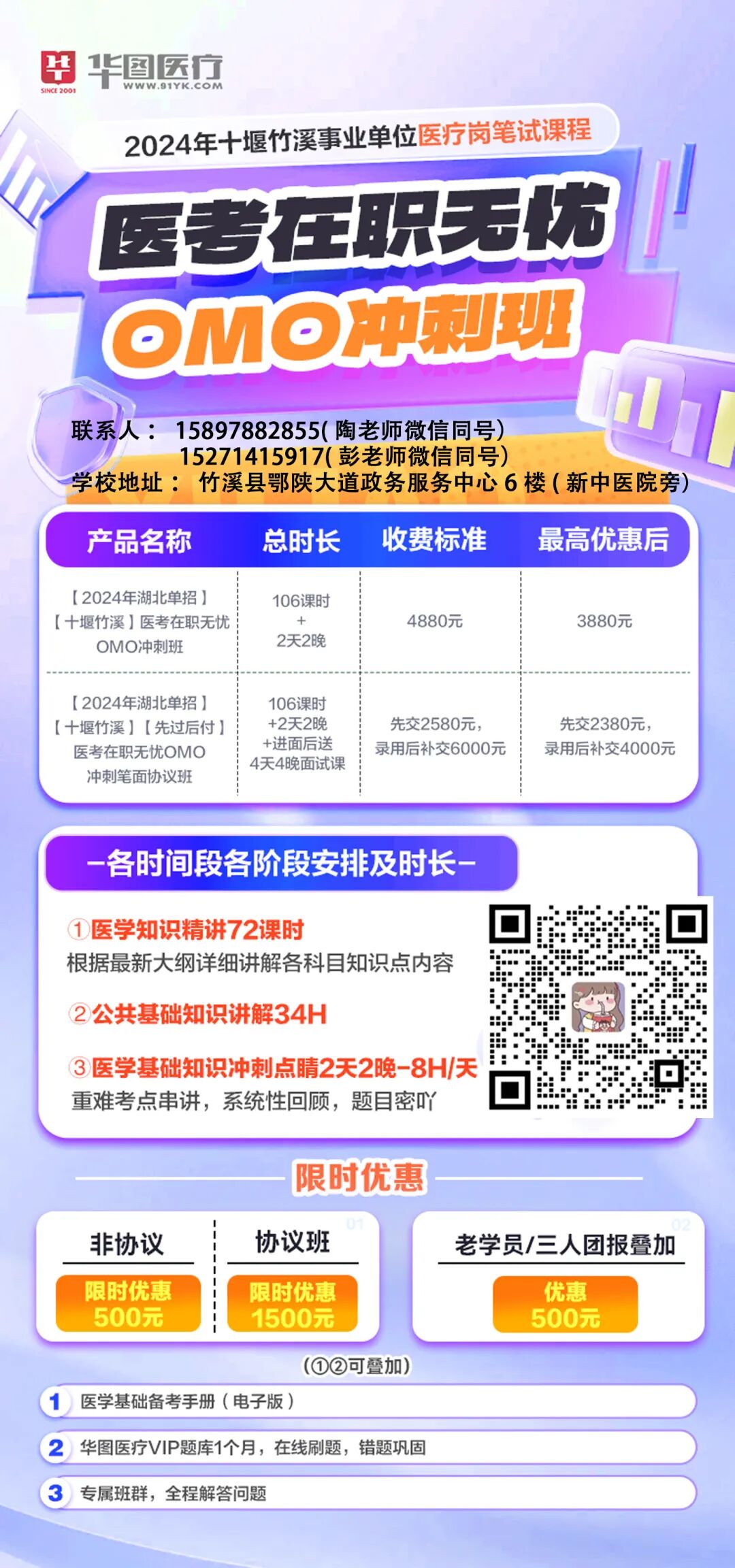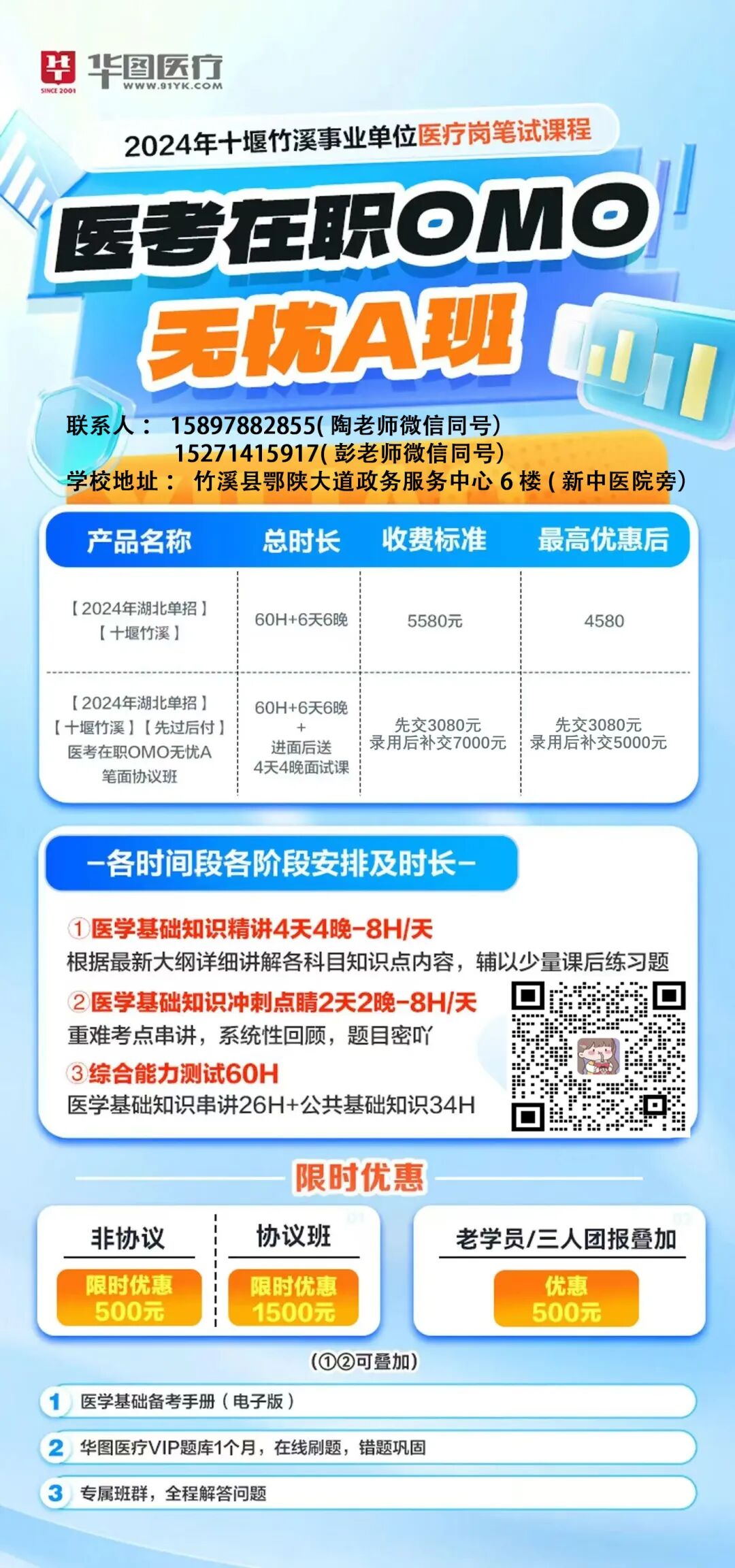 为帮助广大在职考生实现“事业单位上岸”的梦想,华图教育竹溪分校精心打造了高效备考课程!医考在职OMO无忧A班、医考在职无忧OMO冲刺班、医考在职无忧班。三种选择!满足在职备考的全方位学习需求,线上+线下结合,灵活学习,效率更高!助力每一位学员在竞争激烈的考试中脱颖而出。