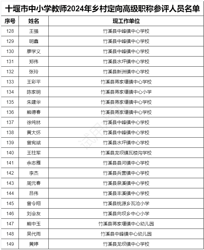 十堰市中小学教师2024年度乡村定向高级职称参评人员名单