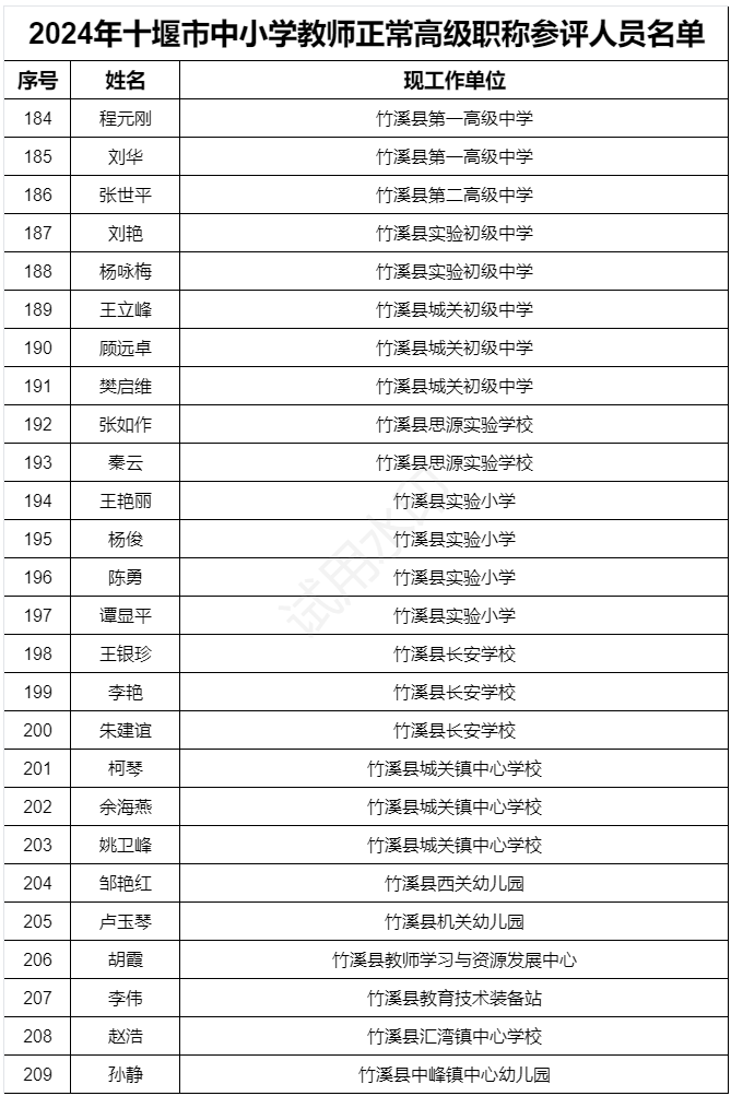 十堰市中小学教师2024年度常规高级职称参评人员名单