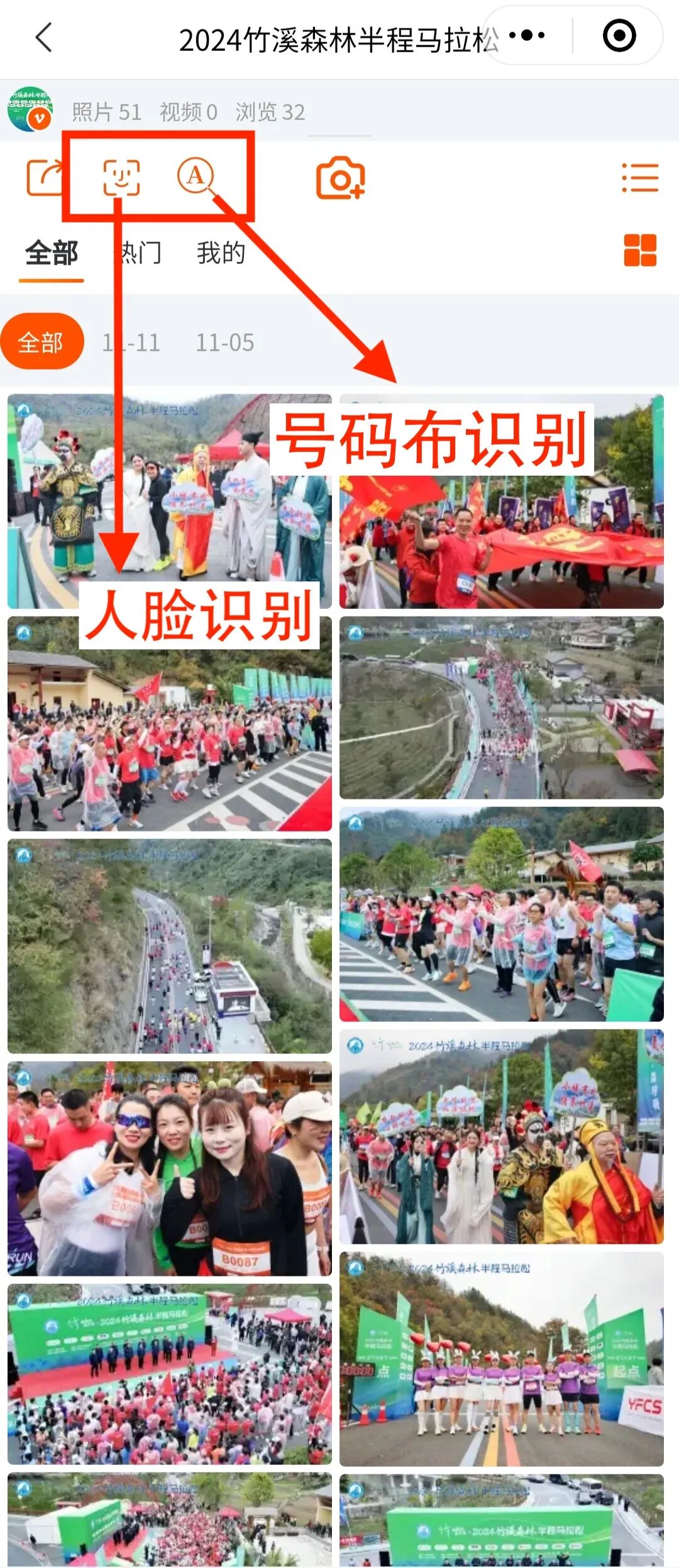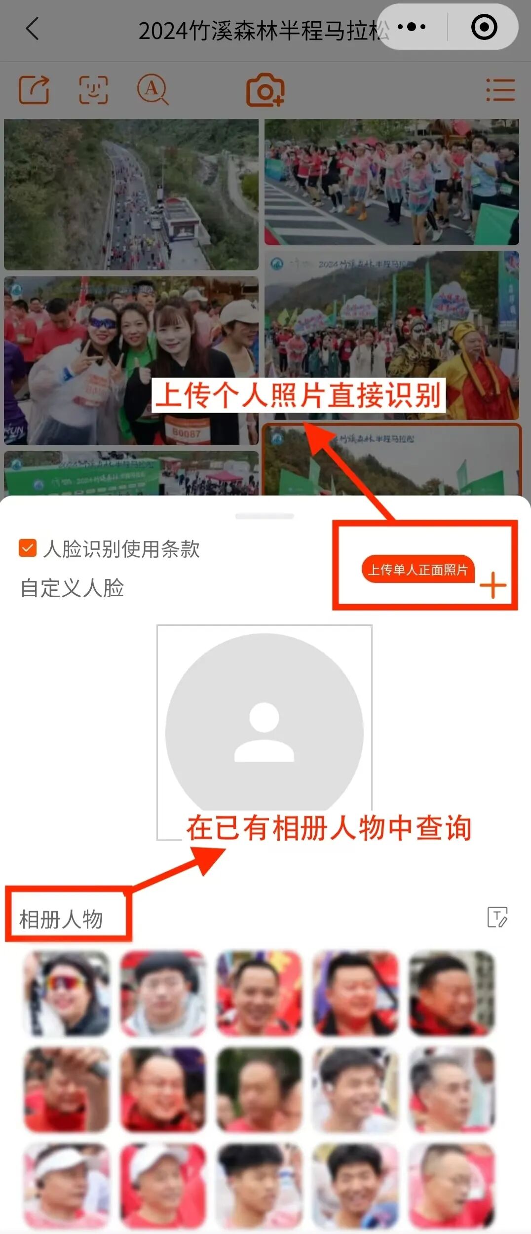 两种方式可供查询选手照片:1、号码布查询 2、人脸识别查询
