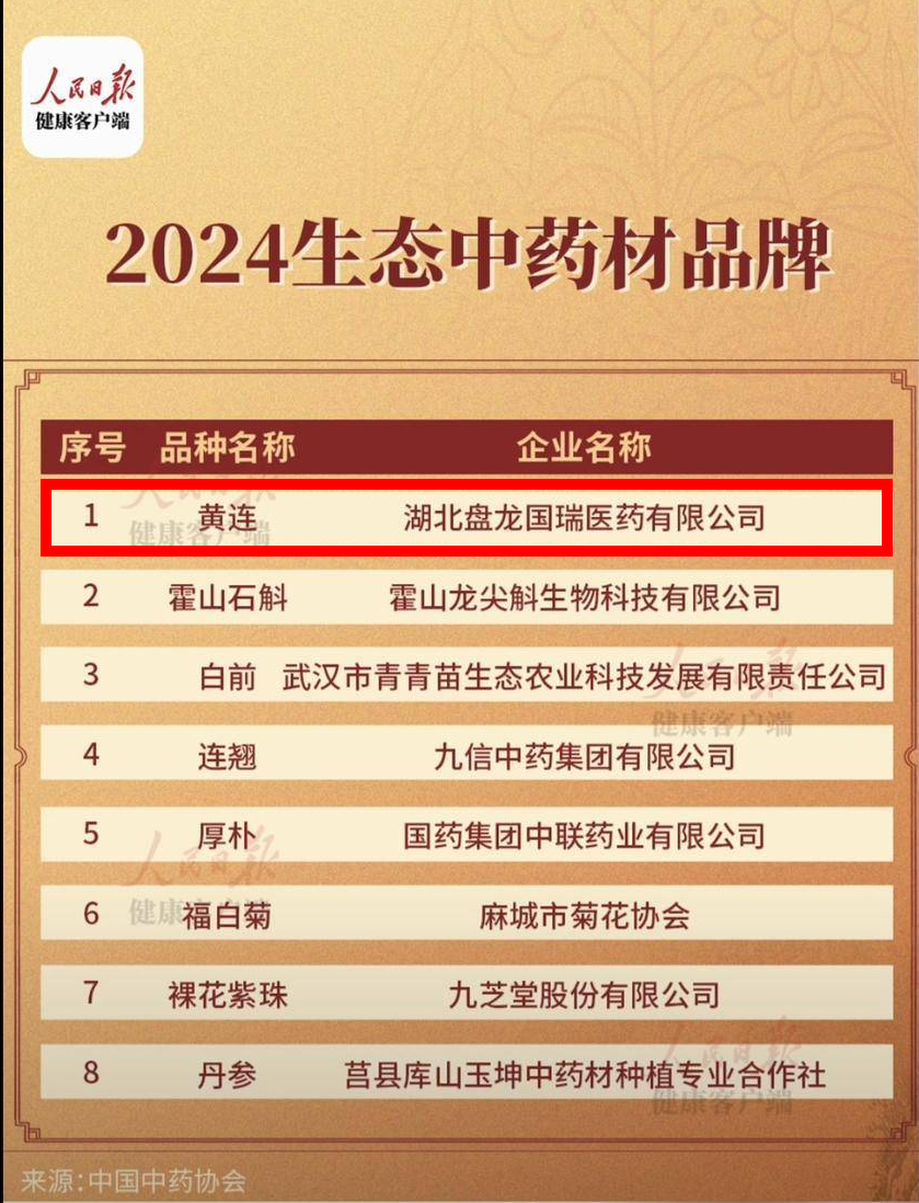 12月8日,2024中国中药产业高质量发展大会暨第五届中国中药品牌建设大会在苏州举办。湖北盘龙国瑞医药有限公司报送的竹溪黄连荣登生态中药材品牌榜榜首。