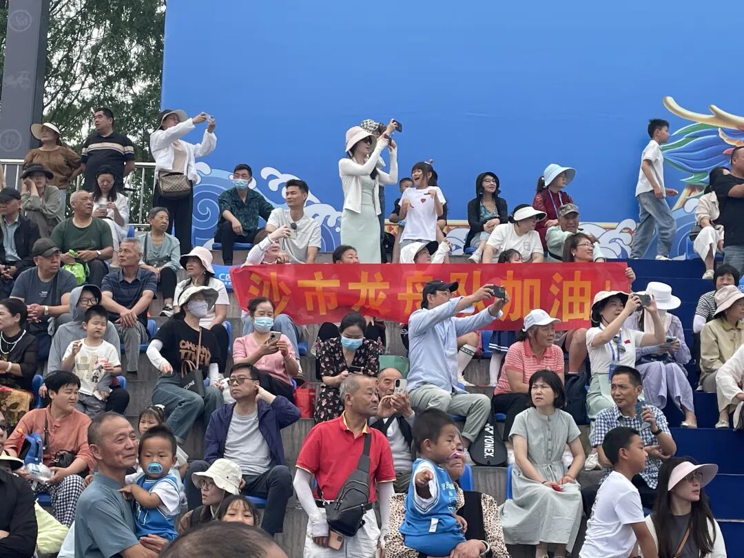 水面上,鼓声阵阵,龙舟飞驰。划手们紧密配合,奋楫前行,一艘艘龙舟你追我赶,为观众献上了一场精彩比拼。岸边,人头攒动、气氛热烈。市民游客呐喊声、欢呼声此起彼伏,将现场气氛推向高潮。