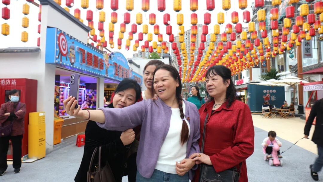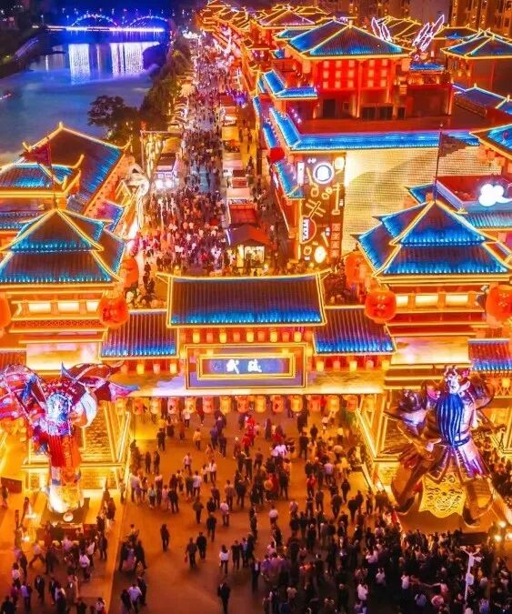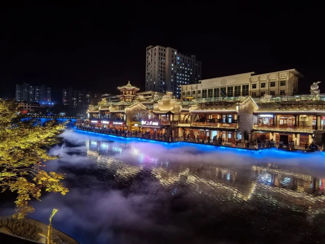 傍晚时分,旅行团转场至竹溪新兴文旅地标——武陵不夜城,灯火璀璨的街区中,一场旗袍秀比赛正优雅上演,现代女性的风采与传统服饰的韵味相得益彰。