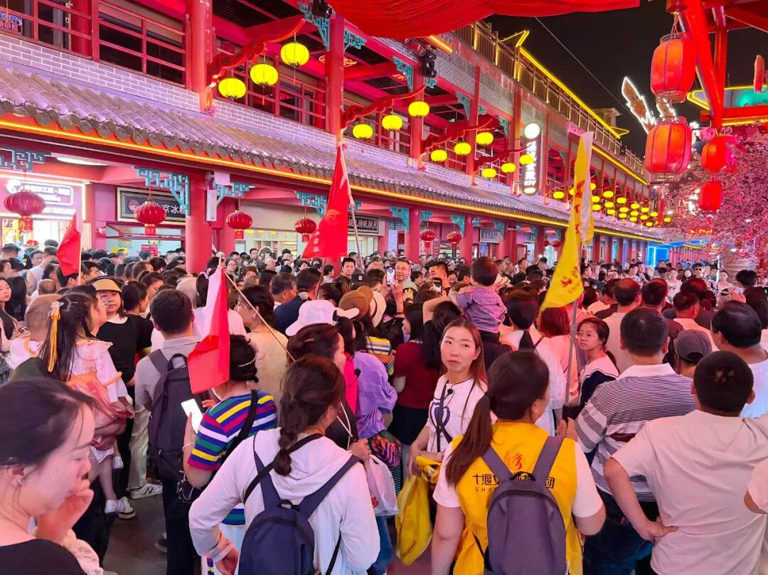 在关垭楚长城,秦楚边关的浑厚历史风貌吸引大批游客驻足探寻;武陵不夜城更是热闹非凡,绚丽灯光与欢腾的广场舞大赛交相辉映,裸眼3D大屏还为陕西游客亮起专属欢迎画面;美食街区里,多样美食化身“能量补给站”,让游客的旅途疲惫在烟火气中消散。