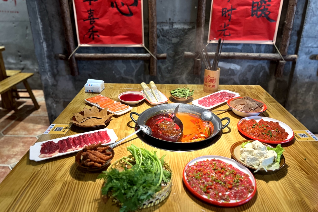 这家店的食材很“竹溪”,主打牛肉来自本地黄牛,羊肉是本地山羊,肉质紧实鲜美,清汤锅一涮就能尝出本味,红油锅底每天现熬,牛油混着十几味香料辣而不燥、层次丰富,蔬菜更是清早采购的农家有机菜,新鲜得能尝出露水味。
