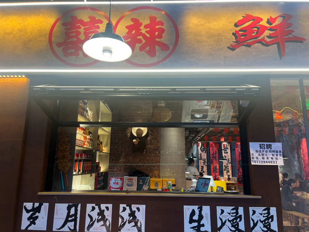 新开业的“新囍辣鲜货老火锅”前,游客们撑着伞排队,火锅底料的香辣味飘得老远,勾得人频频探头。