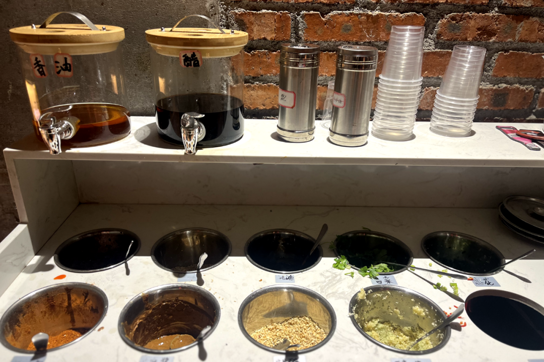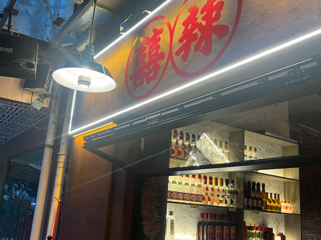 红字黑底的招牌下,木质方桌配长凳衬着红油纸底的字画。传统大盖吊灯洒下暖光,简约复古的氛围,让人忍不住想进去避雨取暖。